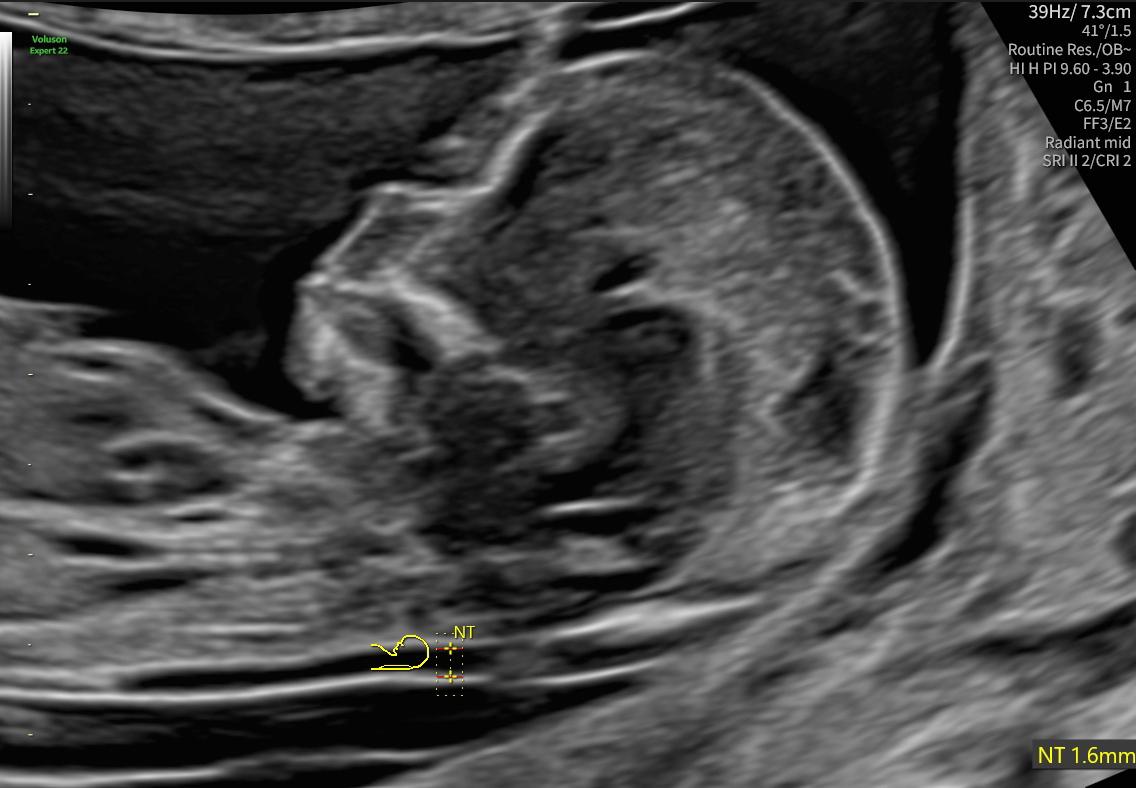 Die Besonderheit im ersten Trimester ist die Messung der Nackentransparenz (nuchal translucency, NT oder „Nackenfalte“ genannt), eine schmale Flüssigkeitsansammlung im Bereich des kindlichen Nackens, die in frühen Schwangerschaftswochen stets nachzuweisen und somit bis zu einem bestimmten Maß als normal anzusehen ist.